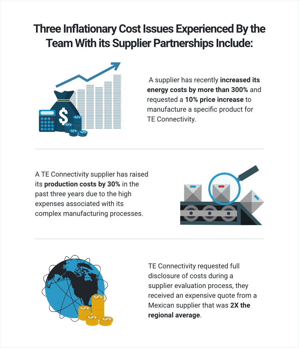 Like other manufacturers, TE Connectivity’s PCA CoE team faces challenges in assessing and mitigating critical product costs with key suppliers. Three inflationary cost issues experienced by the team with its supplier partnerships include: