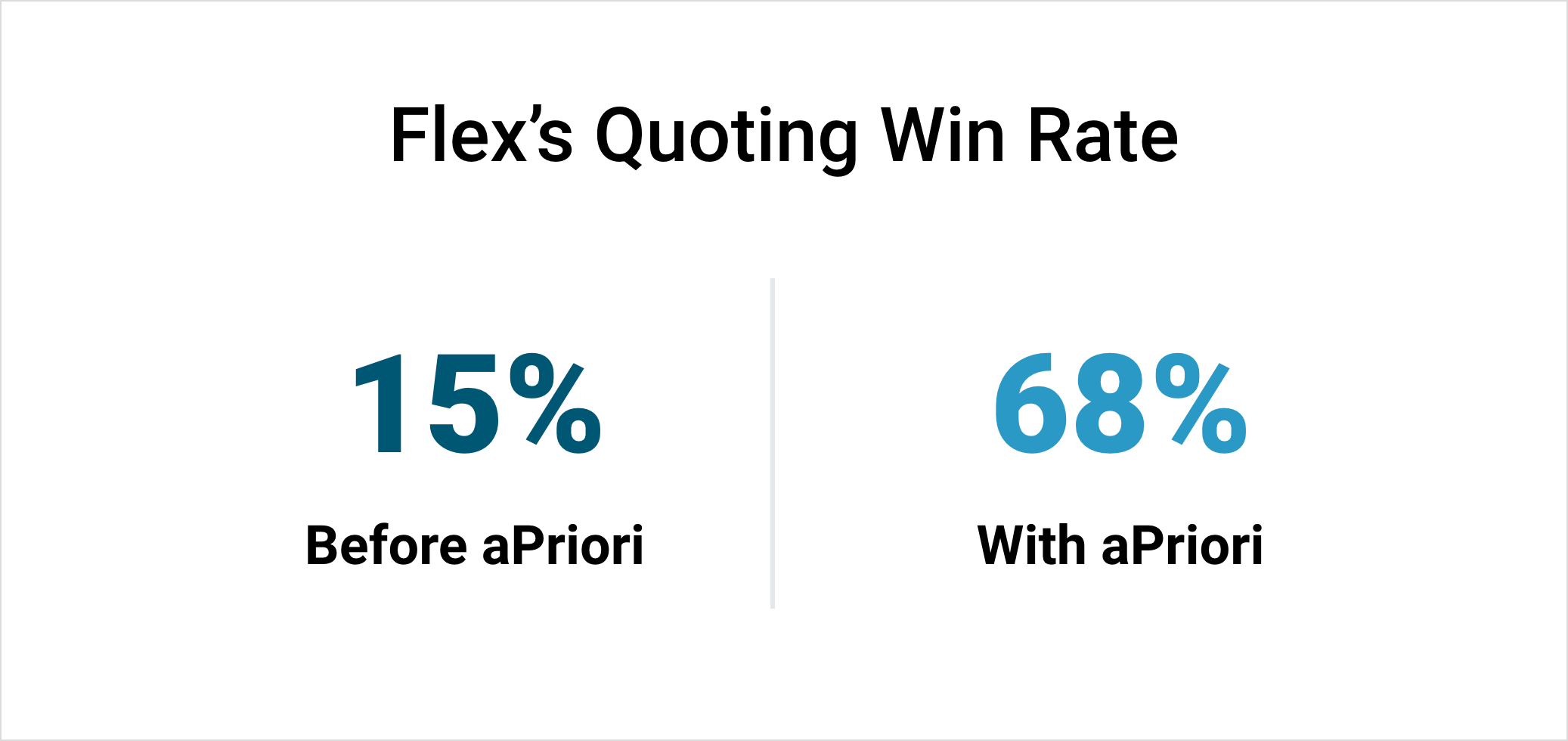 Global adoption has decreased time-to-quote by a minimum of 35% (as much as 80% for some parts). A faster, consistent, and accurate quoting process has directly translated into higher win rates for Flex. Since adopting aPriori, Flex’s overall win rate has improved from 15% to 68%.