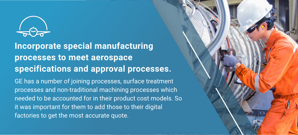 Next, the company was able to incorporate special manufacturing processes to meet aerospace specifications and approval processes. GE has a number of joining processes, surface treatment processes, and non-traditional machining processes that need to be accounted for in its product cost models. So, it was important for the organization to add those to its digital factories to get the most accurate quote.
