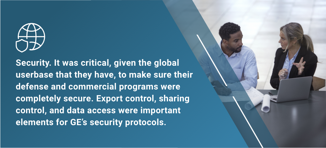 Of course, security was a big concern for GE Aerospace. Given its global user base, it was critical to ensure the complete security of its defense and commercial programs. Export control, sharing control, and data access were important elements of GE’s security protocols.
